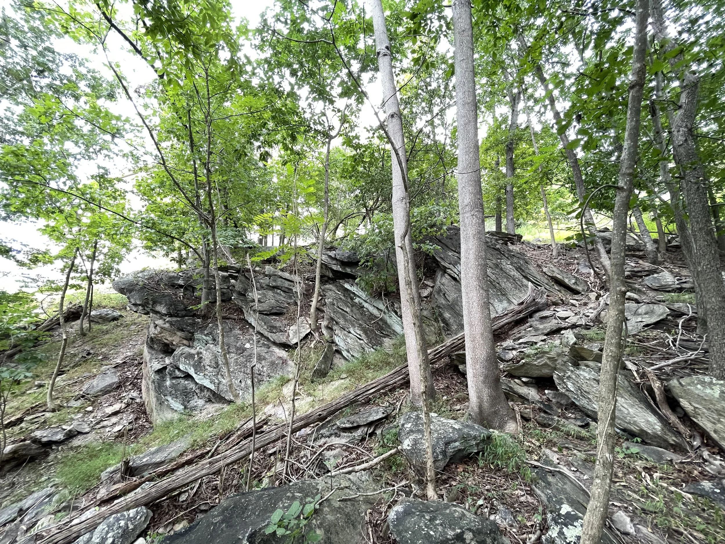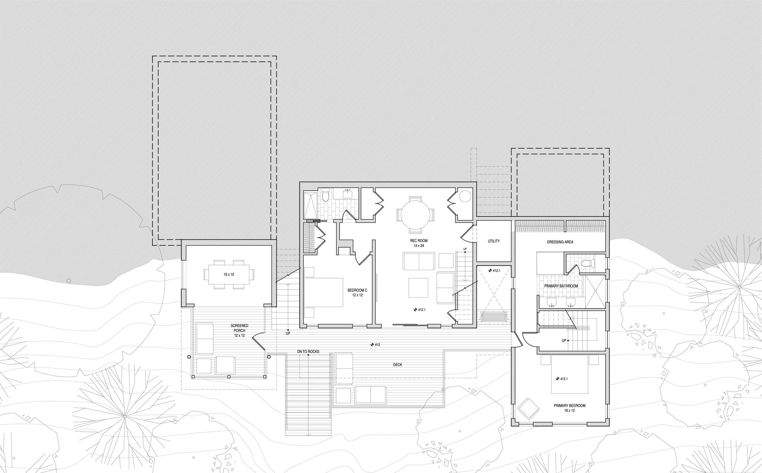 The design for this single-family home in Frederick County, Maryland was influenced heavily by a site that features dramatic grade changes and multiple large rock outcroppings that date to the Cambrian era. A traditional concrete foundation partially buried into the upper slope anchors the north side, while columns allow the southern spaces to extend above the existing limestone, shale and phyllite structures.